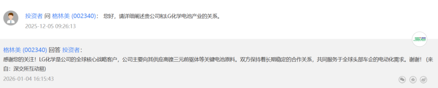 5일 중국 선전증권거래소 투자자 소통 플랫폼 이지동(互动易)에 따르면 거린메이는 LG화학과의 협력 관계를 묻는 투자자 질의에 대해 "LG화학은 당사의 글로벌 핵심 전략 고객사"라고 규정하며 양사 간의 견고한 파트너십을 재확인했다.