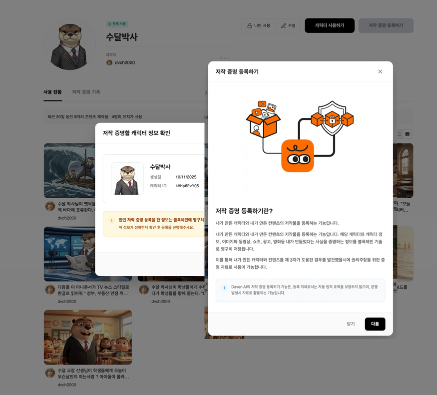 데이븐AI에 따르면 저작 증명 서비스를 이용하면 AI로 생성된 캐릭터와 콘텐츠의 원본 데이터, 생성 시점을 블록체인 네트워크에 기록해 위변조 불가능한 상태로 만들 수 있다. 데이븐AI는 저작 증명 서비스에 대해 법원에서도 인정받을 수 있는 강력한 '원작자 저작 확인' 기능을 제공한다고 설명했다.