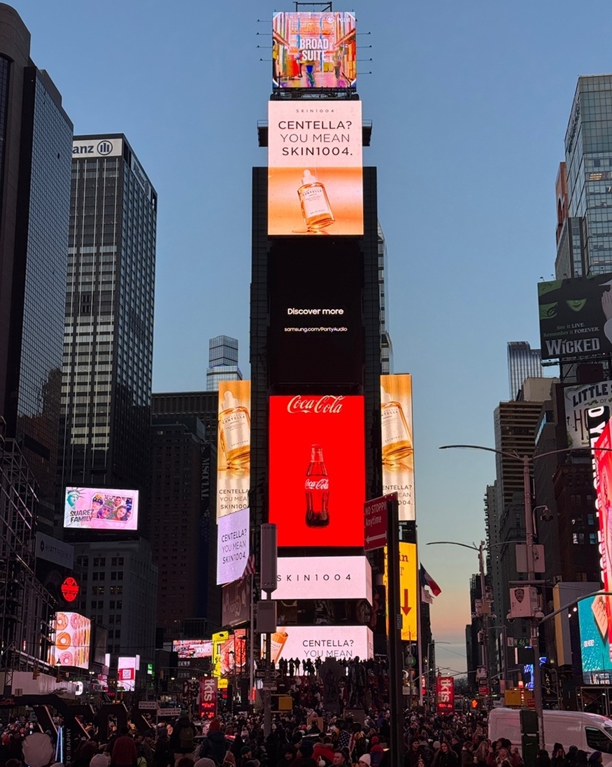 곽인승 크레이버 CBO 겸 스킨1004 브랜드 부문 대표는 “이번 옥외광고를 통해 글로벌 소비자들에게 센텔라 대표 브랜드로서의 존재감을 각인시키고자 한다”며 “오는 1분기 뉴욕 플래그십 스토어를 성공적으로 론칭해 미국 시장 내 영향력을 지속 확대해 나가겠다”고 말했다.