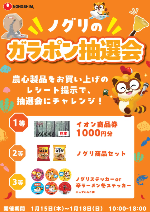 가장 눈에 띄는 지점은 이온모올 치쿠시노다. 이곳에는 너구리 특별 부스가 설치돼 자동 라면 조리기를 활용한 '순한 너구리' 등 농심 라면 무료 시식이 제공된다. 이온 상품권·너구리 세트 등을 증정하는 추첨 이벤트도 함께 운영된다. 현장에서 맛보고 참여하는 방식으로 소비자 체류 시간을 늘린 것이 특징이다.
