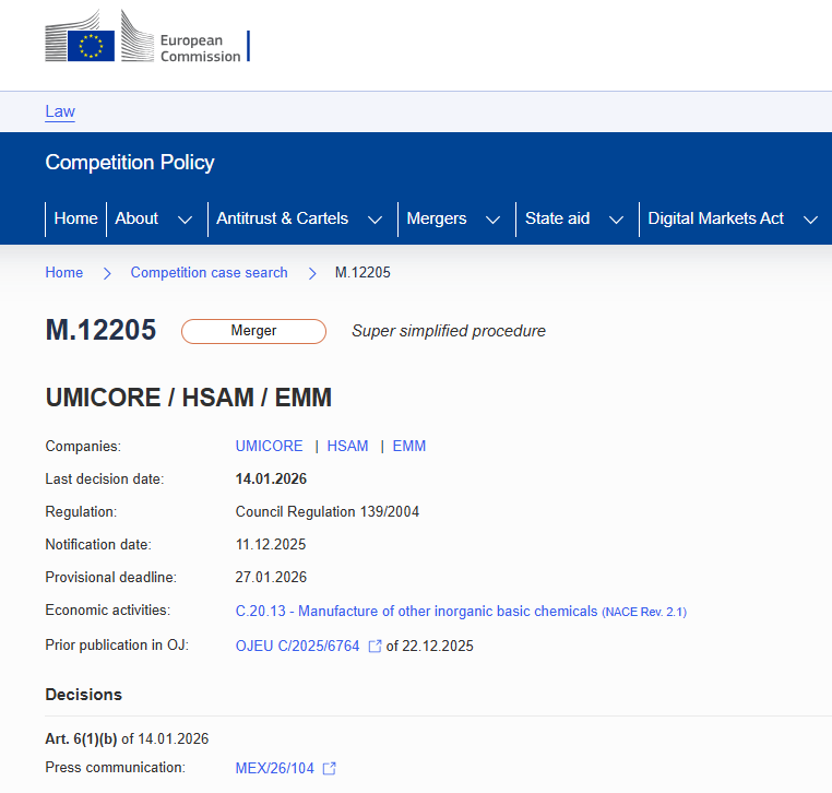 16일 유럽연합 집행위원회(EC)에 따르면 집행위는 EU 기업결합 규정에 따라 HS효성첨단소재와 벨기에 유미코아가 '엑스트라 마일 머티리얼즈(Extra Mile Materials, 이하 EMM)'에 대한 공동 지배권을 취득하는 기업결합을 최종 승인했다.