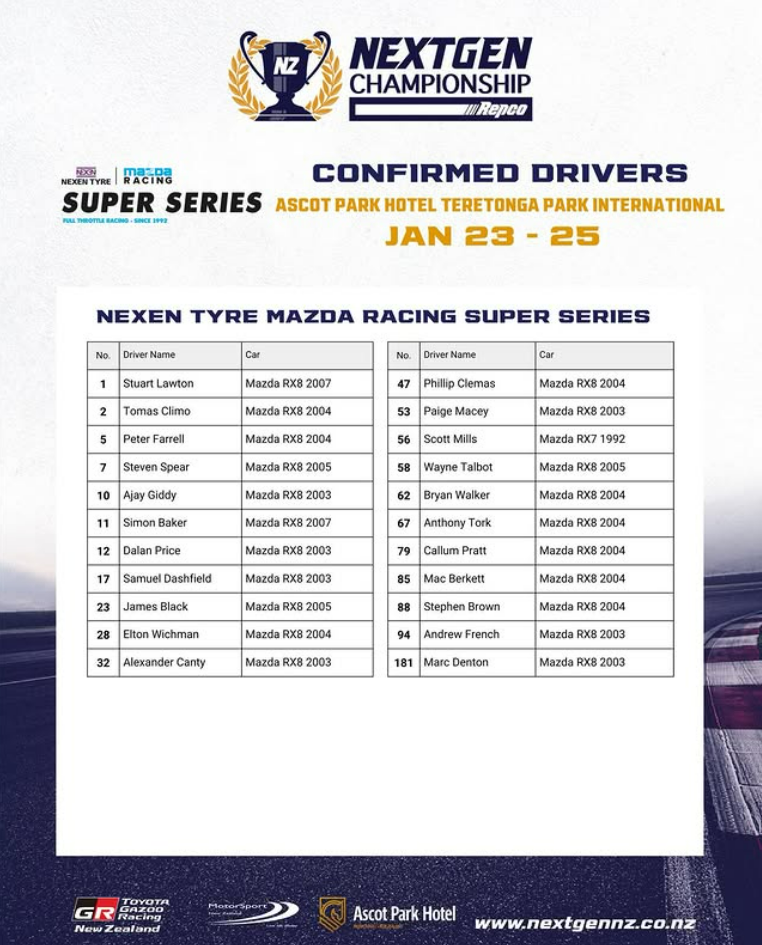 마쓰다 레이싱 슈퍼 시리즈는 뉴질랜드를 대표하는 마쓰다 RX-7·RX-8 원메이크 대회다. 1992년 출범 이후 전통을 이어온 국내 대표 모터스포츠 시리즈로, 북섬·남섬 주요 서킷을 순회하며 경기가 열린다. 경기장은 △맨필드 △햄프턴 다운스 △테레통가 △하이랜드 △토포 등이다.