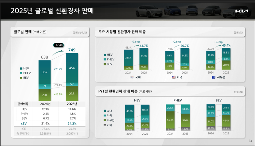 기아의 연간 친환경차 판매는 74만9000대로 전년 대비 17.4% 증가했다. 세부적으로 하이브리드는 45만4000대로 23.7% 늘었고 전기차는 23만8000대로 18.9% 증가했다. PHEV는 5만7000대로 19.4% 감소했다. 전체 판매 대비 친환경차 비중은 24.2%를 기록했다.