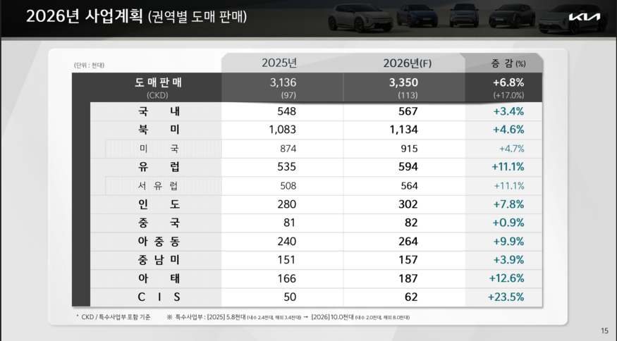 미국에서는 텔루라이드·셀토스 등 신차 출시와 하이브리드 확대를 기반으로 SUV 중심의 판매 성장을 추진한다. 유럽에서는 EV2 출시를 통해 EV3·EV4·EV5로 이어지는 대중형 전기차 라인업을 완성한다. 인도에서는 신형 셀토스 투입으로 프리미엄 SUV 수요를 공략한다.
