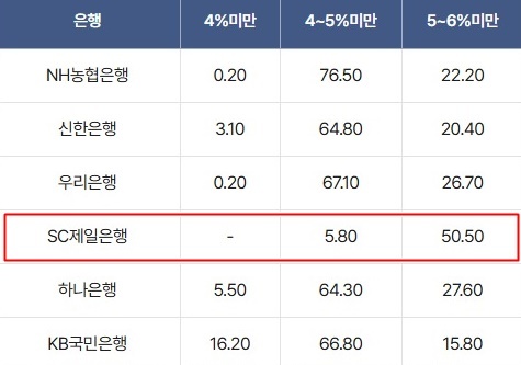 반면 금융소비자에게 유리한 4% 미만 저리 구간에선 SC제일은행 비율이 0.1%로 가장 낮았다. 다른 은행은 △하나 4.2% △신한 7.2% △우리 10.4% △NH농협 26.6% △KB국민 28.8% 등이었다.