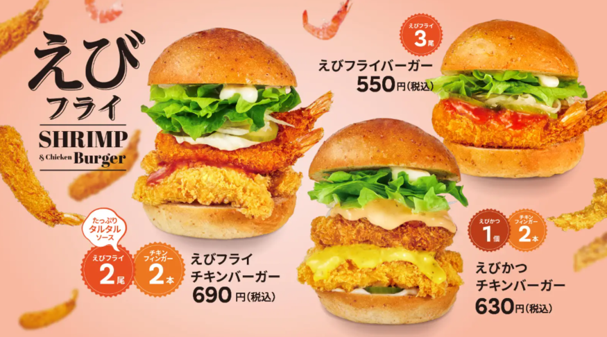 신제품은 새우 튀김을 3마리 사용한 에비 후라이 버거를 비롯해 새우와 치킨을 동시에 즐길 수 있는 '에비 후라이 치킨 버거', 에비카츠와 국산 닭가슴살 치킨 핑거를 조합한 '에비카츠 치킨 버거' 등으로 구성됐다. 서로 다른 식감과 풍미를 살리는 소스 조합에도 공을 들였다. 가격대는 550~690엔으로 점심·간편식 수요를 겨냥한 합리적 수준을 유지했다.