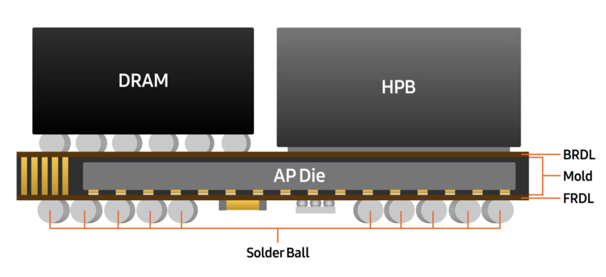 엑시노스 2600에는 FoWLP(Fan-out Wafer Level Packaging) 기반 패키지에 HPB를 결합해 패키지 내부 열저항을 낮췄다. D램 패키지 면적 축소와 비대칭 배치, 신규 열 인터페이스 소재(TIM) 적용을 통해 구조적 제약을 해소한 것이 특징이다.