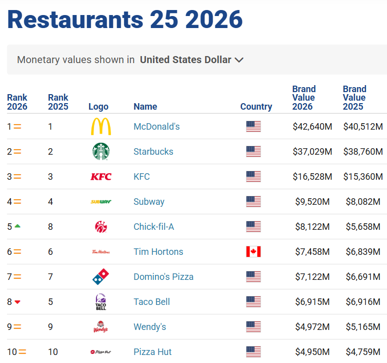 [더구루=진유진 기자] 맥도날드가 글로벌 레스토랑 브랜드 가치 순위에서 2년 연속 1위를 차지하며 세계 최대 외식 브랜드 자리를 지켰다. 고물가와 소비 둔화 환경 속에서도 가격 경쟁력과 디지털 전환, 글로벌 프랜차이즈 기반 등을 앞세워 브랜드 가치를 끌어올렸다는 평가다.