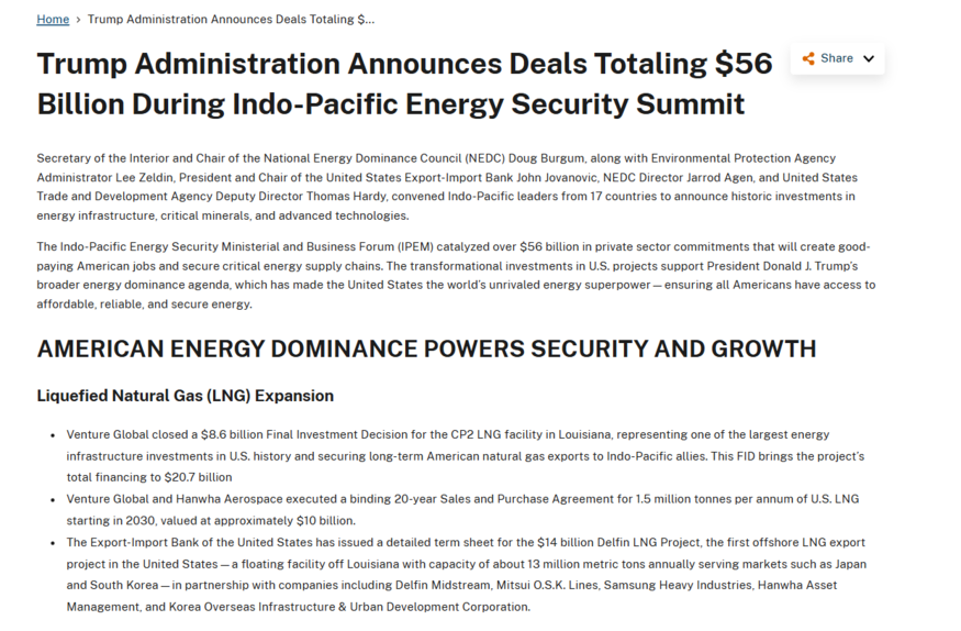 미국은 이번 회의에서 LNG, 원자력, 암모니아 등 다양한 에너지원과 관련 아시아·태평양 지역 기업들과의 협력 계획을 공개했다. 여기에 미국 수출입은행의 델핀 프로젝트 금융 지원도 포함됐다. 수출입은행은 약 14억 달러(약 2조 원) 규모로 델핀 사업에 대해 자금 조달을 지원하기 위한 상세 조건서(Detailed Term Sheet)를 공유했다. 해당 문서에는 본계약에 반영될 주요 내용과 조건이 담긴 것으로 보인다.