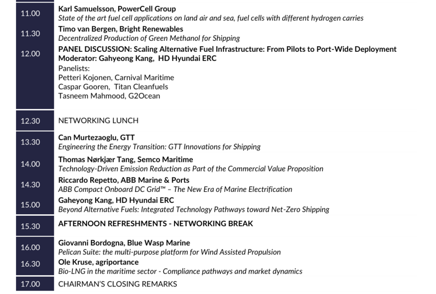 또한 같은 날 오전에 열리는 패널 토론의 좌장을 맡아 대체 연료의 도입에 대해 논의한다. 토론 주제는 '대체 연료 인프라 확대: 시범 사업에서 항만 전반으로의 도입까지(Scaling Alternative Fuel Infrastructure: From Pilots to Port-Wide Deployment)'로, 세계 최대 크루즈 선사 카니벌 코퍼레이션 산하 카니발 마린타임, 네덜란드 친환경 연료 유통사 타이탄 클린퓨얼스, 노르웨이 합작사 G2오션이 토론에 참석한다.