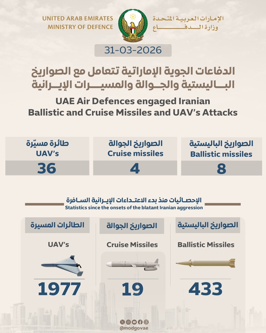 UAE 국방부는 "UAE 방공망은 개전 후 탄도 미사일 433발, 순항 미사일 19발, 무인 항공기 1977대를 요격했다"며 "(국방부는) 어떠한 위협에도 완벽하게 대비하고 있으며, 국가 안보를 저해하려는 그 어떤 시도에도 단호히 맞설 것"이라고 밝혔다.