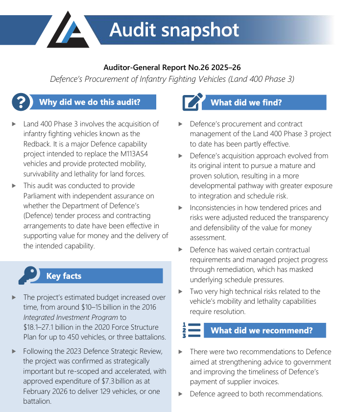 2일 호주 감사원(ANAO)에 따르면 지난달 30일(현지시간) 발표한 감사보고서에서 "랜드400 3단계 사업이 부분적으로만 효과적이었다"고 평가했다.