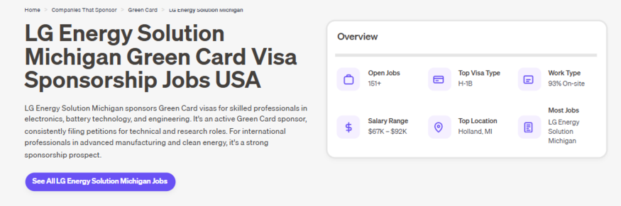 [더구루=오소영 기자] LG에너지솔루션 미시간법인이 글로벌 인재 확보에 나섰다. 홀랜드와 랜싱 공장을 중심으로 에너지저장장치(ESS)용 배터리 생산에 돌입하면서 영주권 지원과 경쟁력 있는 보상을 내걸고 인력 확충에 집중하고 있다.
