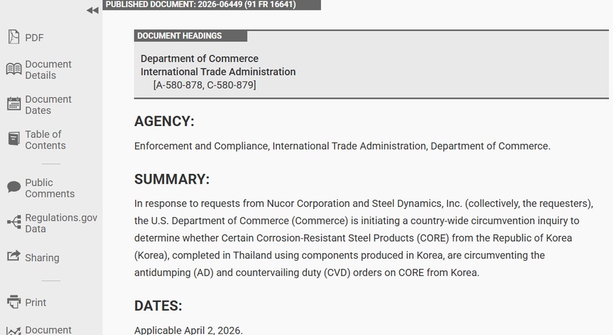 [더구루=길소연 기자] 미국이 태국 도금강판(Certain Corrosion-Resistant Steel Products, CORE) 생산자와 수출업체를 대상으로 한국산에 부과된 반덤핑(AD)와 상계관세(CVD) 명령 회피 조사에 착수한다. 한국산을 사용해 태국에서 완제품을 만든 후 미국으로 수출되는 CORE 공정을 살펴본다.