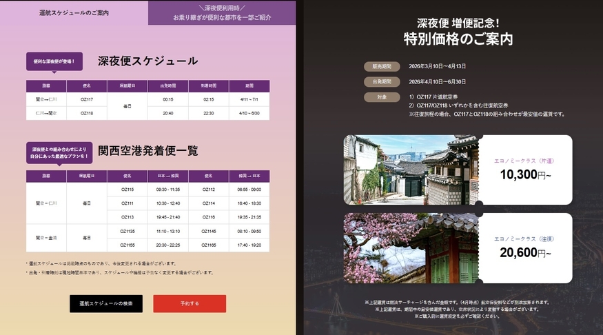 해당 특가 항공권은 아시아나항공 공식 홈페이지와 모바일 애플리케이션(앱)을 통해 구매할 수 있으며, 탑승 기간은 오는 10일부터 오는 6월 30일까지다. 운항 스케줄은 OZ117편이 오전 0시 15분 간사이 공항을 출발해 오전 2시 15분 인천에 도착하며, 귀국편인 OZ118편은 오후 8시 40분 인천을 출발해 오후 10시 30분 간사이에 도착하는 일정이다.