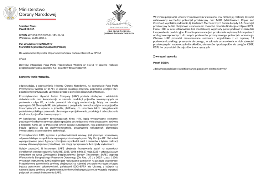 이번 답변은 현지 일각에서 제기된 K2 전차 및 지원 차량 도입 사업에 대한 질의에 대응하기 위해 작성되었다. 앞서 프셰미스와프 비플레르(Przemysław Wipler) 폴란드 하원 의원은 △현대로템의 지원 차량 기술 완성도 △계약 마진의 적정성 △한국 기업 참여에 따른 유럽 방산 강화 기금(SAFE) 활용 가능 여부 등에 대해 상세 설명을 요구했다.