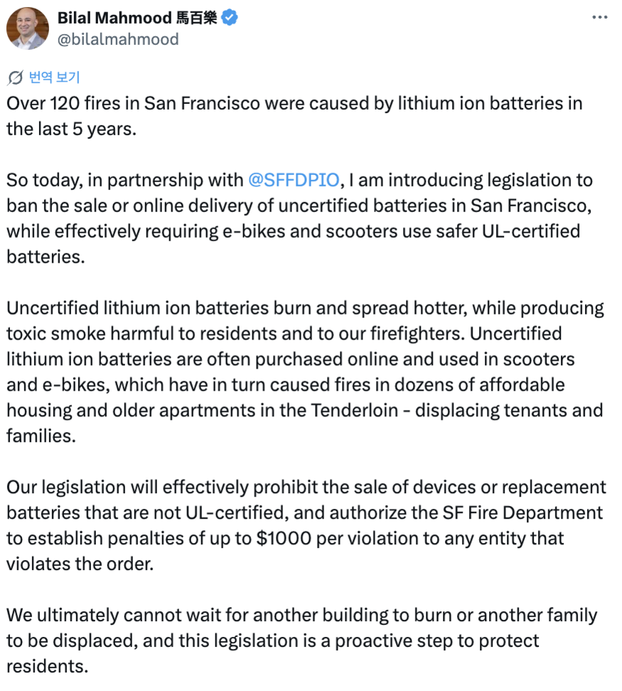 [더구루=김예지 기자] 미국 샌프란시스코 시당국이 전기자전거와 스쿠터 등에 사용되는 미인증 리튬 이온 배터리를 시장에서 완전히 퇴출하기 위한 초강수 조치에 나섰다. 최근 급증하는 화재 사고로부터 시민의 생명과 재산을 보호하기 위해 안전 인증이 없는 제품의 온·오프라인 유통을 원천 봉쇄하겠다는 방침이다.