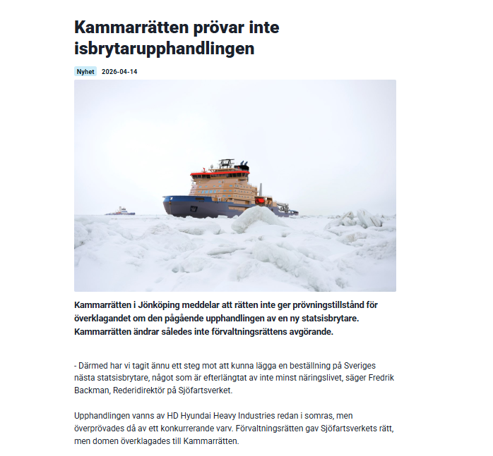 [더구루=오소영 기자] 스웨덴 해사청(SMA)이 신규 쇄빙선 사업을 둘러싼 핀란드와의 법정 다툼에서 승소했다. 1심에 이어 2심에서도 기각 판결을 받아내며 입찰의 정당성을 재확인했다. HD현대의 쇄빙선 사업 수주가 가시화되는 분위기다.