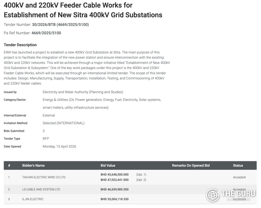 17일 바레인 수전력청(EWA)에 따르면 LS전선과 대한전선, 일진전기 3개 업체는 시트라 신규 400kV 송전망 변전소 구축 사업의 400kV·220kV 피더 케이블 공사 입찰에 참여했다. 지난 13일 개찰이 진행돼 각 사가 제시한 금액이 공개된 상태이며, 최종 낙찰자는 기술·재무 평가를 거쳐 추후 결정될 예정이다.