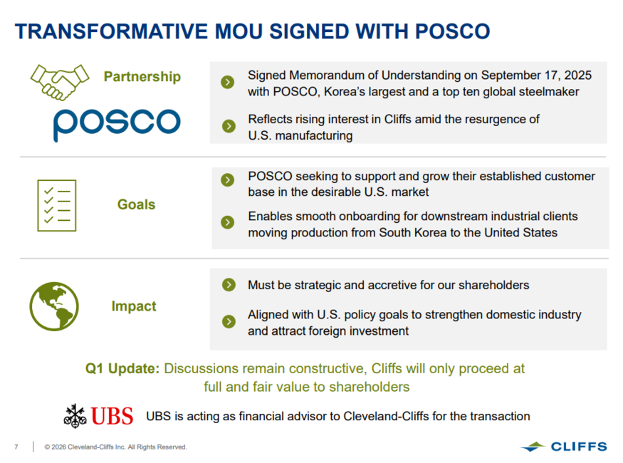 [더구루=김예지 기자] 클리블랜드클리프스(Cleveland-Cliffs)가 포스코홀딩스와 추진 중인 전략적 파트너십 체결을 서두르지 않겠다는 입장을 공식화했다. 미국 내 자동차 산업의 견조한 수요와 철강 가격 회복에 힘입어 재무적 자신감을 회복한 클리프스가 협상 주도권을 틀어쥐면서, 당초 양사가 약속했던 타임라인도 전면 수정이 불가피해졌다.