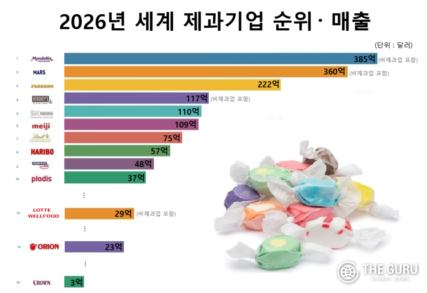 22일 미국 제과 전문지 '캔디 인더스트리(Candy Industry)'가 발표한 '2026 글로벌 100대 제과 기업(2026 Global Top 100 Candy Companies)' 순위에 따르면 롯데웰푸드는 연 매출 29억 달러(약 4조100억원)를 기록하며 전 세계 13위를 차지했다. 국내 제과업계의 또 다른 축인 오리온은 매출 23억 달러(약 3조1700억원)로 15위에 올라 한국 기업 2곳이 나란히 톱15에 포진했다.