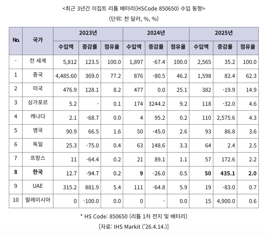 현재 이집트 스마트 미터기 교체 수요의 약 85%는 이집트 전력·에너지부가 주도하는 정부 입찰을 통해 발생하고 있다. 입찰 시장 특성상 가격 경쟁력이 최우선시되면서 지난해 전체 수입 배터리의 62.3%(159만8000달러)를 저가형 중국산이 차지했다. 한국산 배터리 수입 규모는 5만 달러로 시장 점유율 2.0%에 머물렀지만, 수입액 증감률은 전년 대비 435.1% 급증하며 꾸준한 성장세를 기록 중이다.