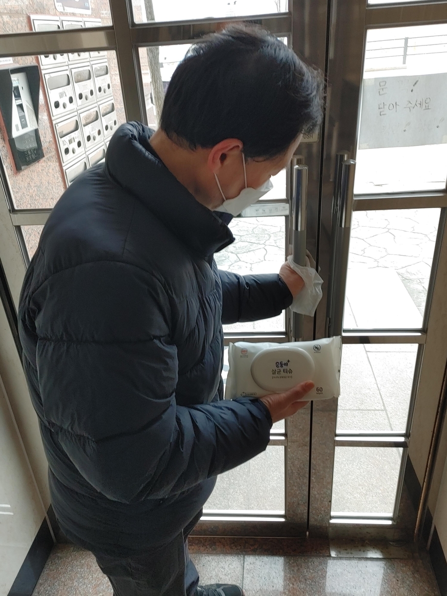 10일 경기도 부천시 범박동에 위치한 다세대 주택에서 순둥이 살균티슈로 건물주가 외부 출입문과 손잡이 부분을 살균, 소독 중이다.