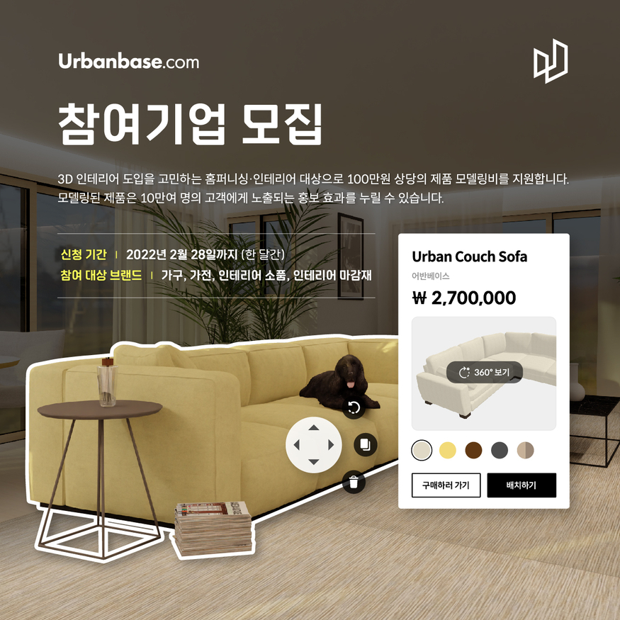 [더구루=최영희 기자] 어반베이스가 디지털 전환을 고민하고 있는 중소·중견 홈퍼니싱 및 인테리어 업체 대상으로 2월 한 달간 ‘무료 입점’ 이벤트를 실시한다고 8일 밝혔다.