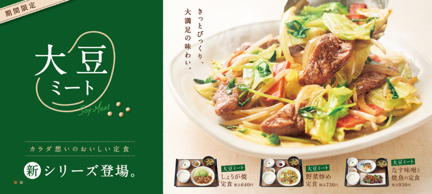 △고기 야채볶음 정식 △돼지고기 생강구이 정식 △가지미소와 생선구이 정식 등 야요이켄의 인기 메뉴에 들어간 고기를 대두 미트로 대체한 것이다. 100% 식물성 원료로 만들어져 부드럽고 고기와 다름없는 만족감을 주는 포만감이 특징이라는 설명이다. 야요이켄은 처음으로 100% 식물성 원료로 만들어진 식물성 고기를 사용한 메뉴를 출시하는 것이라고 전했다. 건강한 식사를 하면서 만족감도 채우고 싶다는 목소리가 소비자들 사이에서 높아지자 해당 요구에 대응하기 위한 것으로 해석된다.