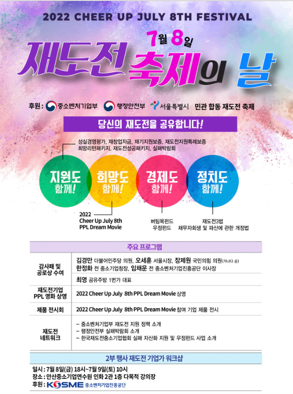 이 외에도 △2022 Cheer Up July 8th PPL Dream Movie 상영 및 참여기업 제품 전시 △중기부 재도전 지원 정책 소개 △행안부 실패박람회 소개 △재도전중소기업협회 실패 자산화 지원 및 우정펀드 사업 소개 △재도전 기업가 교류와 재도전 지원 기관 네트워크 △재도전기업가 워크샵(중진공 안산 중소기업연수원) 등을 개최한다.