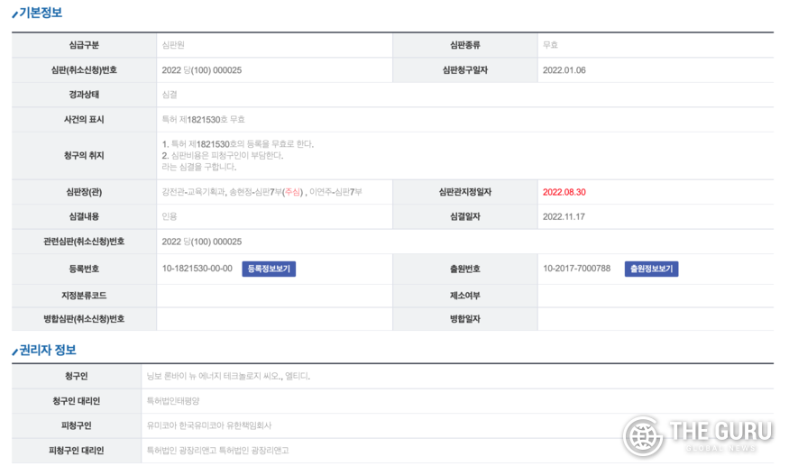 특허심판원은 유미코아가 소유한 '우수한 경도 강도를 갖는 양극 재료(특허 제1821530호)'라는 제목의 특허 등록을 무효화했다. 기술된 각 특허 청구항이 참고문헌과 비교해 실질적으로 동일한 내용을 갖고 있는 등 차별점이 없다는 판단에 따른 것이다.