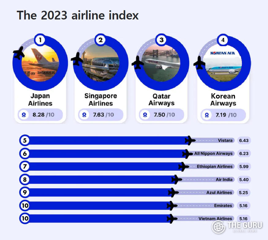 바운스가 발표한 세계 10대 항공사에서 1위는 8.28점을 받은 일본항공(JAL)이 차지했다. 2위는 싱가포르항공, 3위는 카타르항공이다. 인도 비스타라 항공은 5위에 랭크됐다.