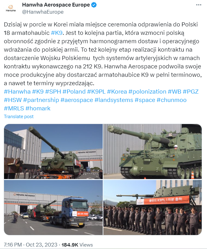 한화에어로스페이스는 이미 폴란드에 K9 자주포의 초도물량 48문을 인도했다. K9A1 자주포 24문의 첫 번째 배치는 작년 12월 12일 폴란드 수바우키(Suwałki)주 벵고제보(Węgorzewo)의 제11 마수리아 포병 연대에 전달됐다. 1차분인 24문의 K9 자주포는 폴란드의 긴급한 요청에 따라 지난해 8월 1차 실행계약 체결 이후 불과 2개월 만에 출하됐다. 우크라이나를 지원하며 전력 공백이 발생한 폴란드는 K9 자주포로 장비를 보완할 수 있게 됐다. 2차분 12문은 올해 2월 폴란드 제14 기갑사단에 공급됐다. 이어 3차분 12문이 폴란드 제1 마수리아 포병 여단에 배치됐다.