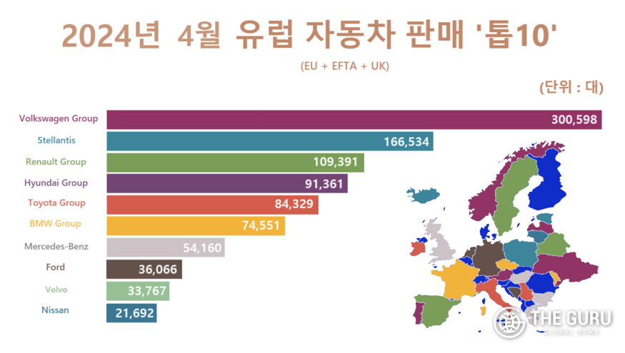 1위는 폭스바겐그룹이 차지했다. 같은 달 총 30만598대를 판매했다. 스텔란티스는 16만6534대로 2위, 르노그룹은 10만9391대로 3위에 올랐다. 5위부터 10위까지는 △토요타그룹(8만4329대) △BMW그룹(7만4551대) △메르세데스-벤츠(5만4160대) △포드(3만6066대) △볼보(3만3767대) △닛산(2만1692대) 순으로 집계됐다.
