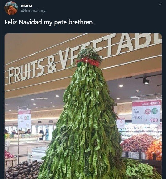 롯데마트는 신규 오픈과 크리스마스 시즌을 기념해 '콩의 대마왕'이라 불리는 퍼타이(Petai)를 이용해 대형 트리를 공개했다. 대형 콩을 계단처럼 쌓아 나무 형태를 만든 뒤 꼭대기에 빨간색 장식으로 크리스마스 분위기를 연출했다.