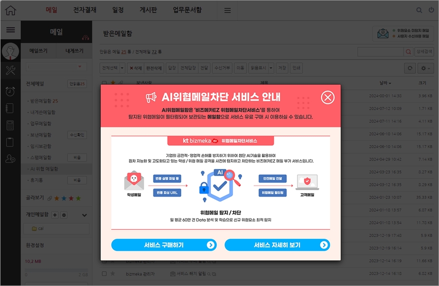 KT가 '비즈메카EZ'에 메일 보안서비스 'AI위협메일 차단서비스'를 적용했다.