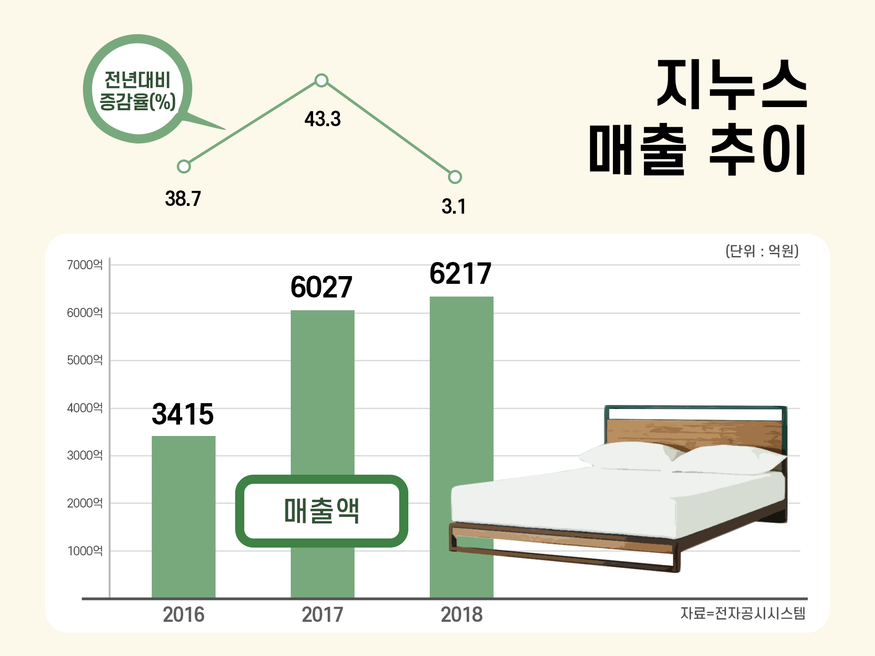 12일 금융감독원 전자공시시스템에 따르면 지누스는 최근 6년 새 매출이 4600억원 성장했다.