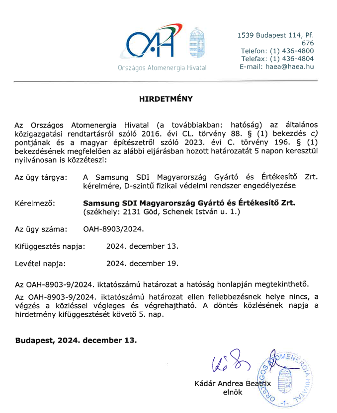 19일 헝가리 원자력청(Országos Atomenergia Hivatal)에 따르면 이 기관은 지난 13일(현지시간) 삼성SDI 헝가리법인의 방사선 설비 사용 허가 연장을 승인했다.