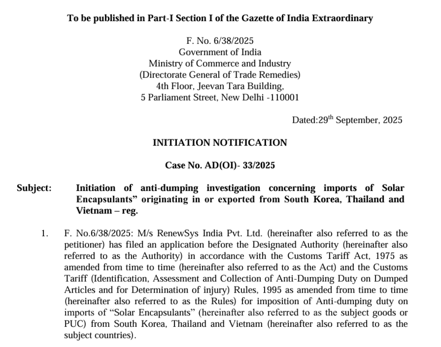 [더구루=오소영 기자] 인도가 한국과 태국, 베트남산 태양전지 봉지재(Encapsulan)에 대한 반덤핑 관세 조사에 돌입했다. 중국과 베트남산 태양광 유리에 반덤핑 부과를 결정한지 약 1년 만이다. 자국 태양광 제조업을 키우며 규제를 강화하고 있다.