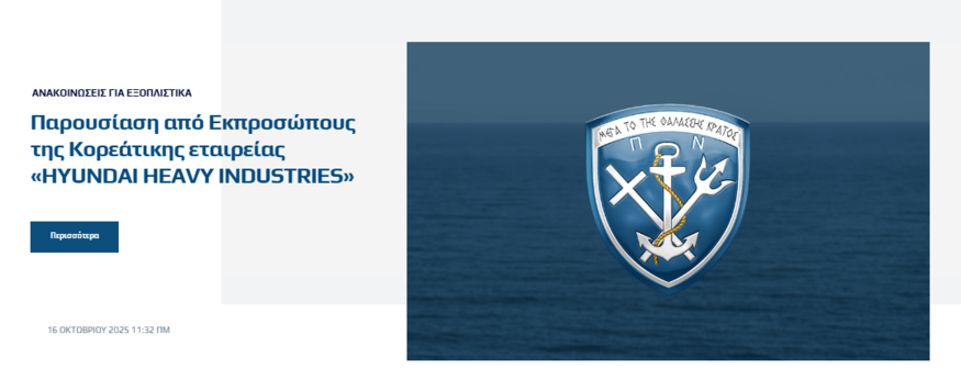 21일 그리스 해군과 디펜스 인더스트리 유럽 등 외신에 따르면 HD현대중공업은 지난 15일(현지시간) 그리스 해군 참모부(Hellenic Navy General Staff)와 회의를 가졌다. 잠수함과 수상함을 제안하고 군함 사업 협력을 논의했다.