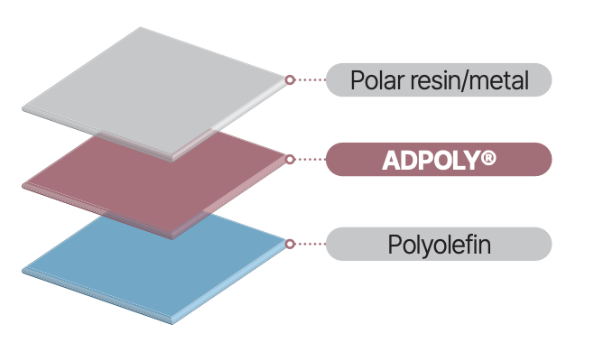 애드폴리는 롯데케미칼이 자체 기술로 개발한 접착성 고분자 수지다. 특수한 공중합 기술로 극성기를 도입해 서로 다른 재료끼리도 강하게 접착될 수 있으며 병, 시트, 필름, 파이프 등 다양한 제품의 접착층이나 복합재료용으로 활용된다. 접착력 강화와 열반응이 가능한 점 때문에 금속, 가스 차단성 수지 등 이종 소재와 결합할 수 있어 다층 구조 제품 제조에 적합하다.