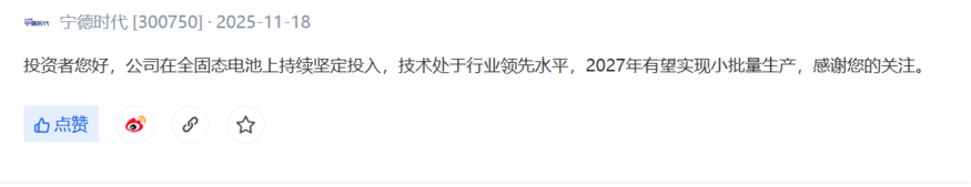 CATL은 지난 18일(현지시간) 중국 선전증권소 투자자 소통 플랫폼(深交所互动易)에서 "2027년께 전고체 배터리를 소량 생산하겠다"고 밝혔다.