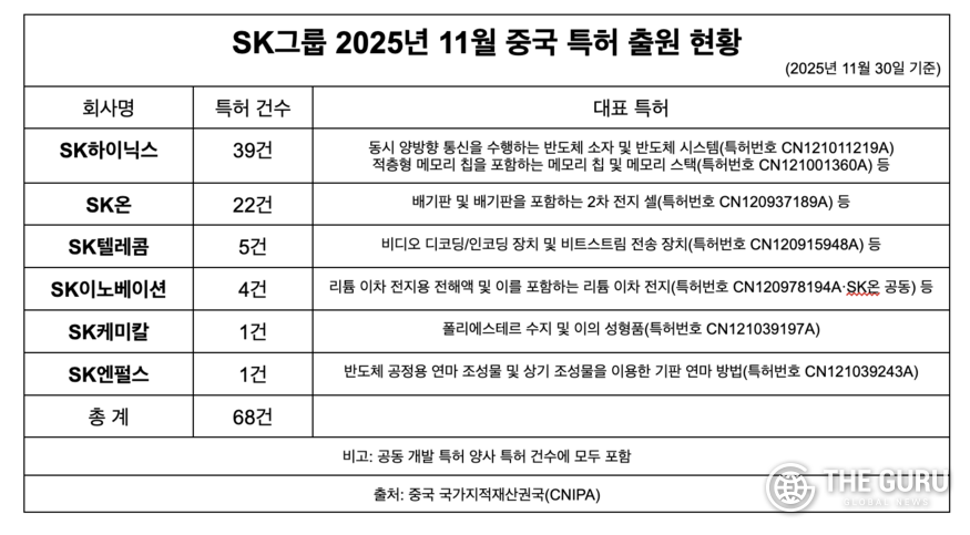 이밖에 SK케미칼은 '폴리에스테르 수지 성형 기술(특허번호 CN121039197A)'로 소재 경쟁력을 확보했고, SK엔펄스는 '반도체 기판 연마 기술(특허번호 CN121039243A)'을 통해 제조 공정 지원 능력을 강화했다. SK텔레콤은 '세션 제어와 데이터 처리 기술(특허번호 CN121002938A)' 및 '비디오 디코딩·인코딩 기술(특허번호 CN120915948A)'로 통신 서비스 성능 향상에 주력했다.