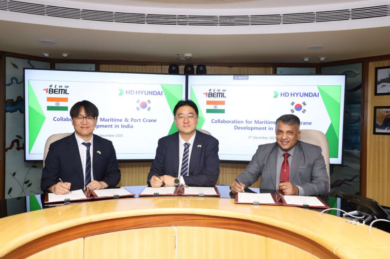 BEML는 5일(현지시간) 인도 BEML 벵갈루루 본사에서 HD한국조선해양, HD현대삼호와 함께 인도 차세대 해상 및 항만 크레인 설계·제작을 위한 3자 양해각서(MOU)를 체결했다고 밝혔다.