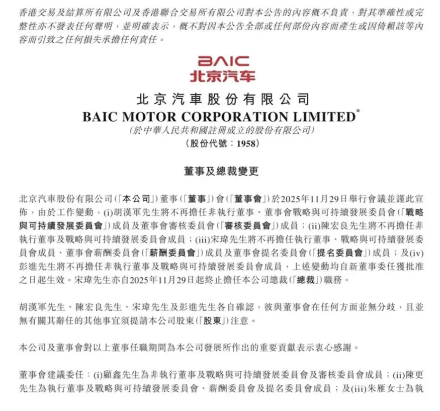 한편 이번 인사에서는 총재 교체뿐만 아니라 후한쥔, 첸홍량 등 기존 이사 4명이 동시에 물러났으며, 자본 운영 전문가인 구신과 재무 전문가 주옌이 이사회에 새로 합류했다. 이는 창사 이래 드문 규모의 경영진 물갈이로, 재무 건전성 및 자본 운영 전문가를 핵심에 배치함으로써 BAIC가 운영 효율성 강화와 자산 구조조정에 주력하겠다는 의지를 보인 것으로 해석된다.