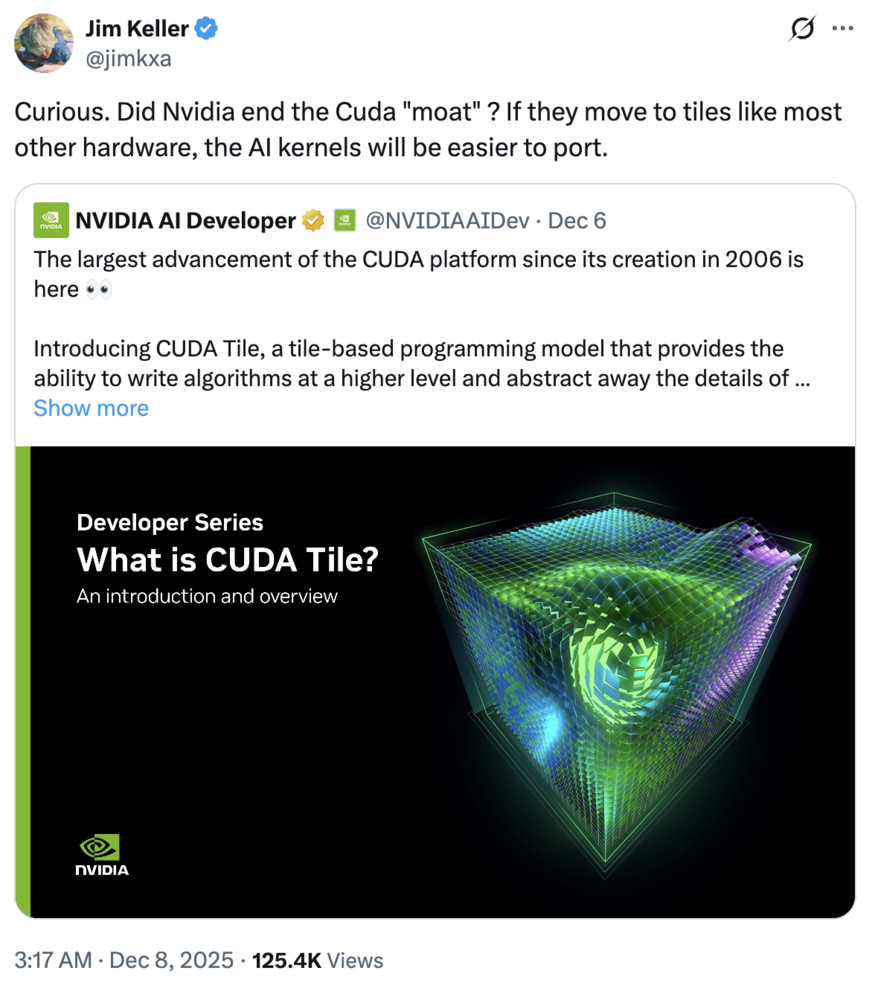 [더구루=정예린 기자] 짐 켈러 텐스토렌트 최고경영자(CEO)가 최근 엔비디아의 그래픽처리장치(GPU) 개발 플랫폼 '쿠다(CUDA)' 업데이트가 기존 독점 구조를 흔들 수 있다는 의구심을 드러냈다. 엔비디아에 대한 개발자의 의존도와 충성도가 낮아지면서 생태계가 약화돼 엔비디아의 시장 지배력이 시험대에 오를지 주목된다.