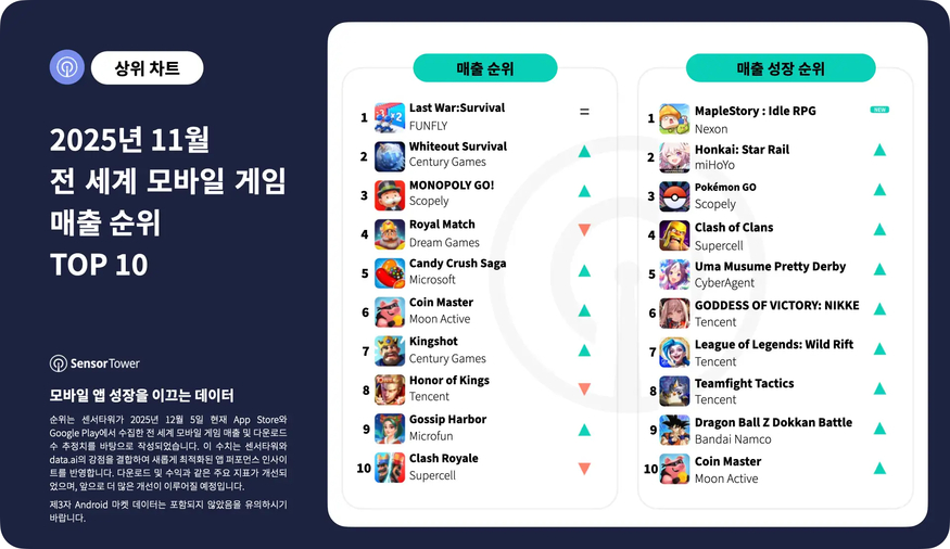 전체 매출 순위에서는 중국 게임의 강세가 이어졌다. 11월 글로벌 모바일 게임 시장 매출 1위 게임은 펀플라이의 '라스트 워: 서바이벌'이었다. 2위는 센추리게임즈의 '화이트아웃: 서바이벌', 3위는 스코플리의 '모노폴리 고'였다.