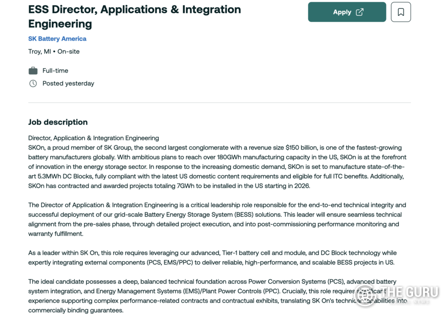 16일 업계에 따르면 SK온 미국 생산법인 'SK배터리아메리카(SK Battery America)'는 최근 'ESS 애플리케이션 및 통합 엔지니어링 담당 티렉터'에 대한 채용 공고를 게시했다. 유틸리티급 배터리 에너지저장시스템(BESS) 프로젝트 전반의 기술 판단과 시스템 통합을 책임질 관리자급 인재를 대상으로 한 공개 채용이라는 점에서 업계의 관심이 쏠린다.