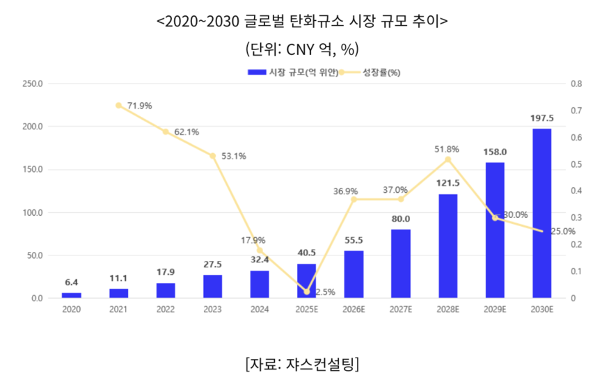 20일 쟈스컨설팅에 따르면 글로벌 탄화규소 시장 규모는 2020년 약 6억4000만 위안에서 2024년 약 32억4000만 위안으로 확대됐다. 오는 2030년 글로벌 탄화규소 시장은 약 197억 위안 규모로 성장할 것으로 추산된다.