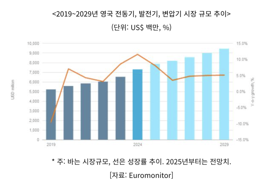 25일 시장조사기관 '유로모니터'에 따르면 영국의 전동기·발전기·변압기 시장 규모는 2024년 기준 73억500만 달러로 전년 대비 11.6% 증가했다. 해당 시장은 2029년까지 연평균 5.3% 성장할 것으로 예상되며, 서유럽에서는 독일·스페인·이탈리아에 이어 네 번째로 큰 규모다.
